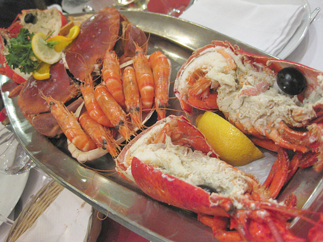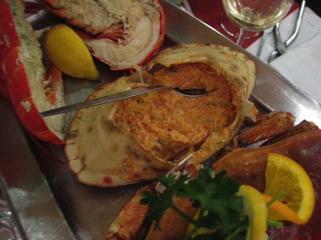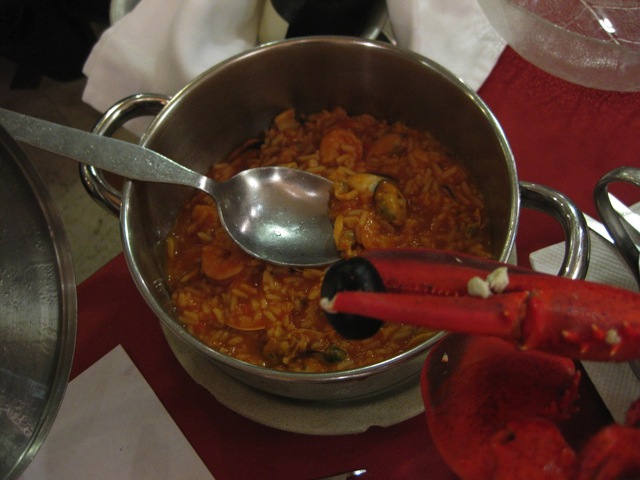 本日は、生ガキよりもエビ、カニをとことん食べたいという欲求に従い〈Riz Royal〉という盛り合わせ(46.9€/2人前)を3人で分けることにする。せっかくなので、Monte Velhoというポルトガルの白ワインをボトル(22.64€)で注文。盛り合わせは、オマール2尾、トゥルトー1杯、エビ8尾にリゾット風のごはん付き。数だけだとこれで3人分? と不安になるが、エビもカニも大きく、身もハサミの部分までぎっしり詰まっているからご安心を。私たちは、食欲おう盛な、女子2名に男子1名だったが、デザートはもう入りませんというくらいにおなかいっぱいになった。エビもカニも新鮮だからプレーンな状態で食べてもおいしいし、添えられたニンニクの効いたマヨネーズにつけても味わい深い。魚介ごはんはムールやエビの入ったトマト風味。温かいごはんものでシメられるのも嬉しい限り。