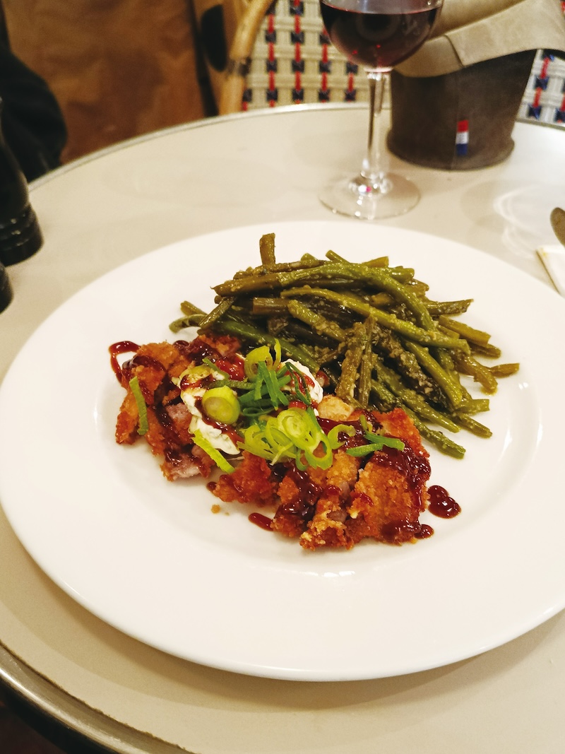 小イカは(冒頭の写真)、ニンニクの香りも香ばしく、柔らかで、いくらでも食べられそうな最高の前菜。そして高まる期待とともに現れたイベリコ豚は、見た目がかなりトンカツ!しかも、メニューに記載があったラビゴットソースも添えられてはいるのだが、その上から掛けられているのはまぎれもないトンカツソースだ。イベリコ豚のなかでもプルマという希少部位をつかっていることもあって、非常においしいのだが、どうしてもトンカツとしか思えなくてちょっぴり残念。付け合わせのインゲンのソテーも抜群のうまさ。