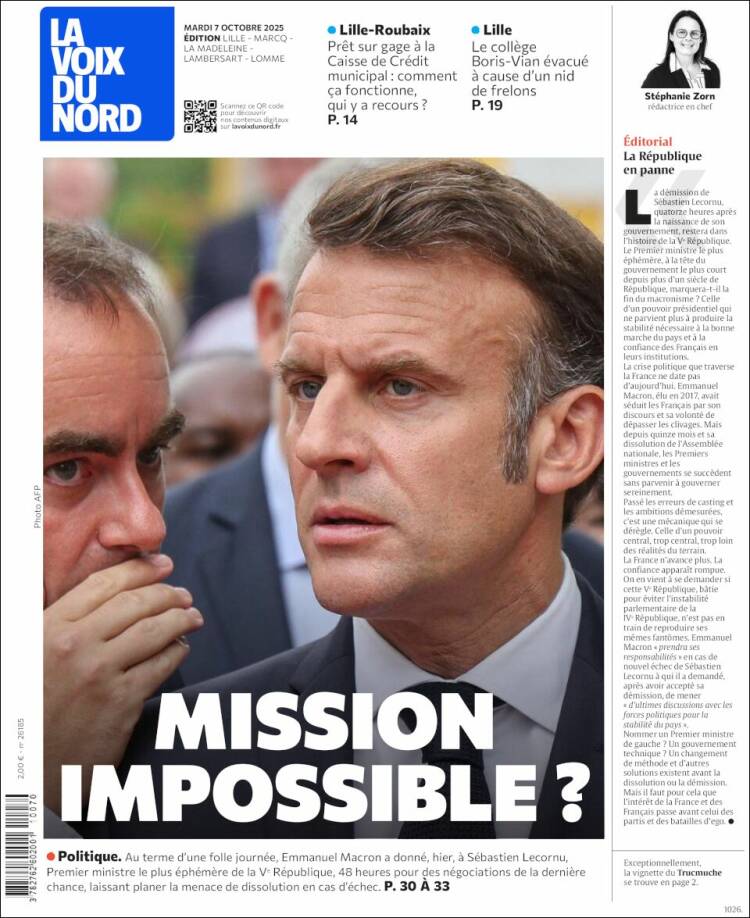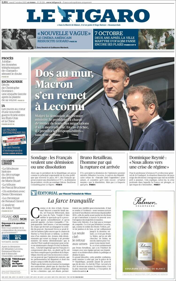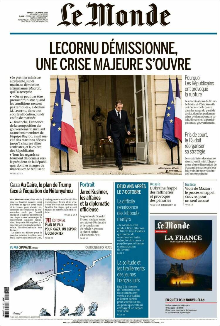 ルコルニュ首相は10月6日に辞表をマクロン大統領に提出し、受理された。前日5日に新内閣の顔ぶれが発表されたばかりだったが、始動する前に早くも辞職内閣となった。首相就任後1ヵ月未満の辞任に政局はますます混迷の色を深めている。