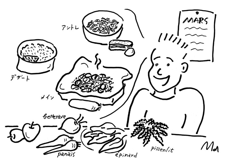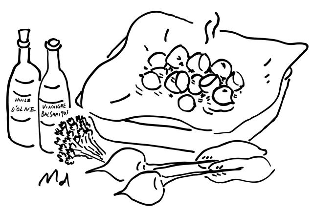 メインには、冬ならではの根菜に活躍してもらう。ビーツbetteraveのホイル焼きを紹介したことがあるが、ビーツだけでなく、パースニップpanais、ニンジンや皮つきの小さめのジャガイモなどいっしょにホイルで包めば、それぞれの根菜の味わいの違いをたのしむことができる。くん製風味のソーセージ、モルト― morteauやモンべりアール monbéliardを、ゆでたり焼いたりしたものに付け合わせれば、ぜいたく、ぜいたく!