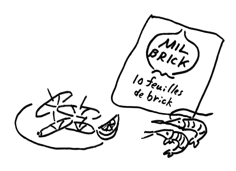 マグレブ料理に欠かせないブリックの皮は、小麦粉が原料の薄い皮で、最近はほとんどのスーパーで手に入る。ふつう、直径30センチほどの円形の皮が10枚入って2ユーロ前後。5,6枚を六つの三角形に切り分ける。むきエビ300グラムを包丁でたたいてミンチ状にする。おろしたショウガとニンニク少々、小口切りにした万能ネギ2本を混ぜ入れ、軽くコショウ。皮に塩気があるので、塩する必要はないだろう。エビのミンチを三角形の皮の幅の広い方に置いて巻き込み、楊枝でとめる。後はブリックの皮がキツネ色になるまで揚げるだけ。皮のおかげで油がとばないのもうれしい。タバスコソースとレモンのしぼり汁を混ぜ合わせたものを添える。