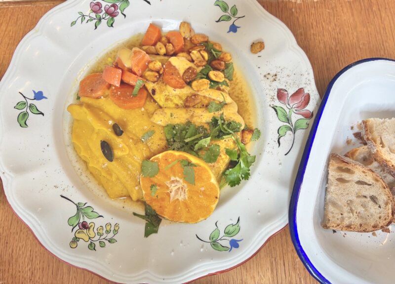 この日の前菜は人参、生姜、コリアンダーのポタージュ、またはカブや大根など根菜のサラダ。どちらも繊細な味付けで、新鮮な素材そのものの風味を感じられる。
