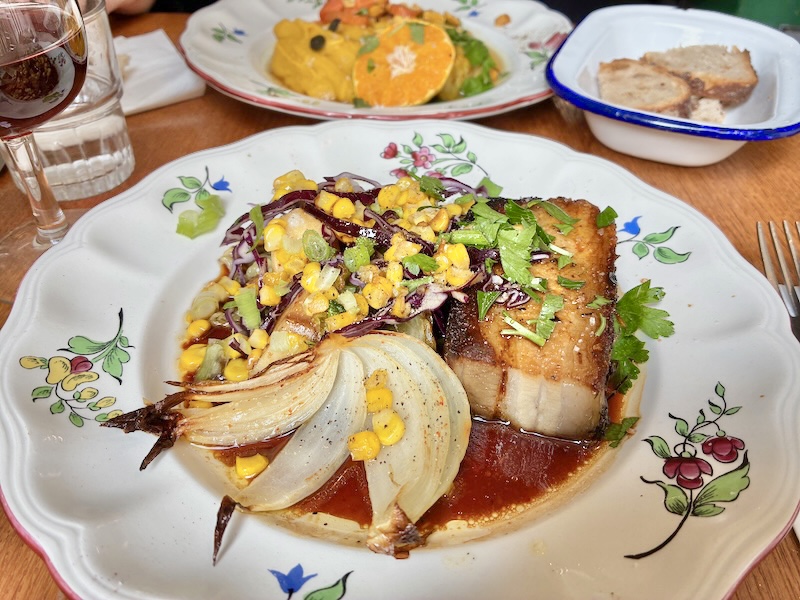 メインは豪快な豚の三枚肉。身は柔らかく表面はカリッと仕上げ、ちりめんキャベツ、リンゴ、とうもろこしに玉ねぎなど様々な野菜のバターソテーがふんだんに添えてある。彩りも綺麗で、見た途端に食欲が倍増する。