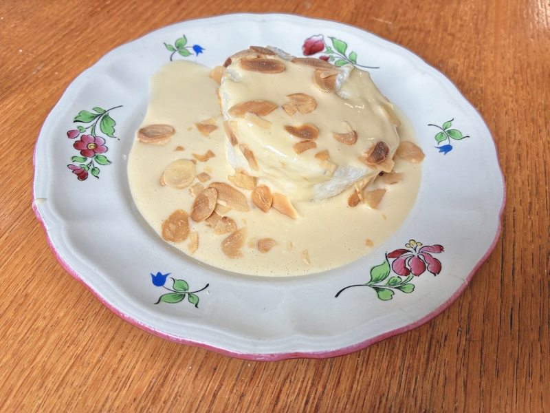 デザートはイル・フロッタント。干し草で香り付けをしたクレーム・アングレーズは甘すぎないため、いくらでも食べられそう。フレンチアンティークのお皿がまた可愛らしくて、器好きにはたまらない。