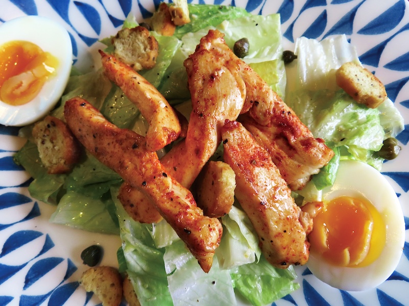 サラダ菜にドレッシング適量を加えて混ぜ合わせ、各人の皿にとる。鶏の胸肉をたてに切り分け、塩、コショウ、パプリカ粉も振って数分いため、サラダ菜にのせる。ゆで卵を二つに切って添える。写真に見えるクルトン(パンの小片を油で揚げたもの)は、Tipiak 印のニンニク風味。(真)